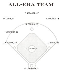 The meat of each volume, however, is contained in each of the eight "team" chapters. Following a uniform format, each chapter first graphs the team's win-loss performance for each of the 19 years of the deadball era (example shown is for the Boston Red Sox of the American League). In addition, an "all-era" team with
