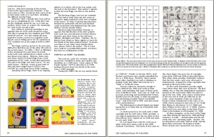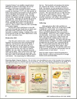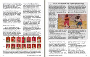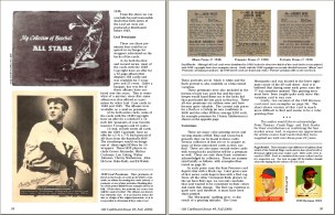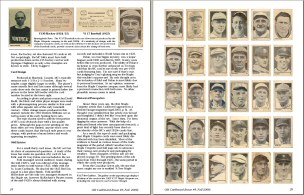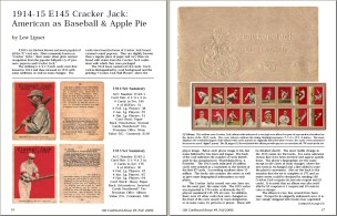 Articles in the issue are written by some of the hobby's most informed experts and about some of it's most interesting vintage sets. They include: 1) "1914 & 1915 E145 Cracker Jack: American as Baseball & Apple Pie" by Lew Lipset. Hobby stalwart Lipset expands on his landmark Encyclopedia of Baseball Cards in an article that includes a full 172-card image gallery of the 1915 "superset" and an image of the scarce album described in the premium offer on the backs of all 1915 CJ cards. Also added is a backgrounder on the company that produced the famous brand.