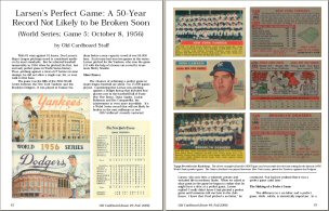 4) "Larsen’s Perfect Game: A 50-Year Record Not Likely to be Broken Soon" by Old Cardboard Staff. Setting: October 8, 1956, Game 5 of the World Series between the Yankees and the Dodgers. A tribute to Yankee pitcher Don Larsen who, fifty years ago this month, pitched the first, last and only Perfect Game in World Series history. Odds predict that the record will not likely be broken in the next millenia or so.