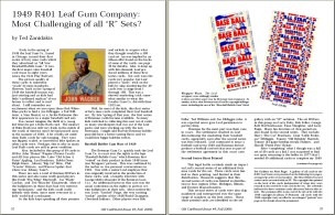 2) "1949 R401 Leaf Gum Company: Most Challenging of all 'R' Sets?" by Ted Zanidakis. A detailed description of this well known set written by a collector that started his set when the cards were first released. While some in the past have dated the set as 1948 or 1948-49, Zanidakis makes a strong case that all of its cards were distributed in 1949. Includes a full set gallery, image of a full "1st series" sheet and much more.