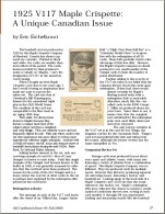 3) "1925 V117 Maple Crispette: A Unique Canadian Issue," by Eric Eichelkraut. The ins and outs of this relatively obscure Canadian set is explained in detail. Also presented is the author's convincing argument that the set was originally produced in 1925--not 1923 as indicated in most hobby checklists. Article features a full set gallery including an image of ultrarare card #15--the only known example that features Casey Stengel.