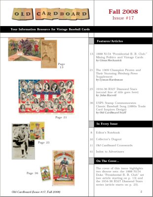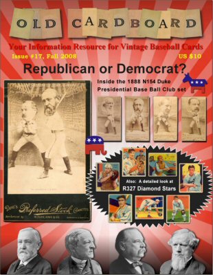 The articles in this issue include: 1) "1888 N154 Duke "Presidential B. B. Club." authored by longtime collector Glenn Mechanick, provides a detailed look at this unique series issued by Duke Tobacco. The set is keyed to the presidential election of 1888 and provides a glimpse into presidential politics of 120 years ago. Includes an updated and annotated checklist of all known cards in the set as well as a comparison of the four "players" featured on the cards.
