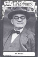 | The earliest card picturing Ed Barrow was produced by the Baseball Hall of Fame as part of the long-running 1950-56 Callahan set. Subsequently, a 1953-55 Artvue HOF Postcard of Barrow was issued and would represent the last card of Barrow to be produced for several years. In 1960, Fleer decided to include Barrow as part of their All-Time Baseball Greats set. There were a couple of commemorative cards produced of Barrow in later years including the 1973-80 TCMA All-Time Greats set and the 1976 Shakey's Pizza set. |