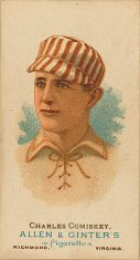 | The most popular Charles Comiskey Rookie Card originates from the 1887-90 Old Judge tobacco set. In addition, Comiskey also appeared on an 1887 Buchner Gold Coin set card, although this issue is not a popular one with many collectors. Two other 1887 issues depicting Comiskey are significantly more difficult to find, the Lone Jack Browns and Gypsy Queens. Finally a card of Comiskey was included in the popular 1888 Allen & Ginter tobacco set. |