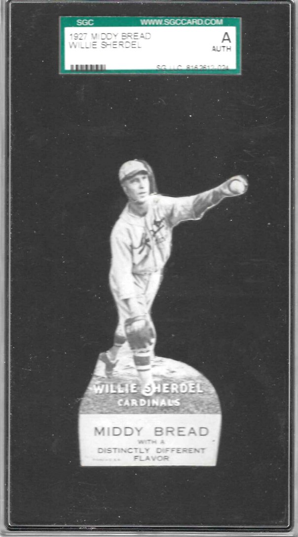$590 This card featuring Willie Sherdel is part of the 1927 Middy Bread Die-Cut set, which is a regional (St. Louis) issue highly sought by vintage collectors due to its unique design and extreme scarcity. Sherdel was a key figure for the Cardinals during their 1926 and 1928 World Series runs. A crafty left-hander, he remains the winningest left-handed pitcher in Cardinals history with 153 wins for the franchise. The year 1927, when this card was issued, was one of Sherdel's best seasons, where he went 17-12 with a 3.28 ERA. The card is graded as SGC Auth due to tape and slight paper loss on the back. Otherwise, a very appealing example for the set. Further details about this 1927 Middy Bread Die-Cuts are provided on the Old Cardboard website.