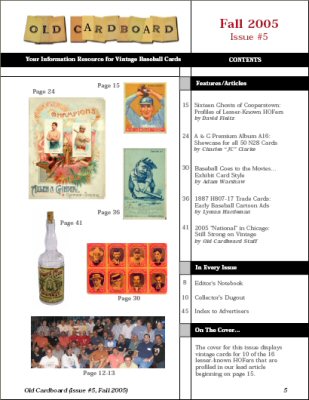5) "2005 'National' in Chicago: Still Strong on Vintage" by Old Cardboard Staff. A wrap-up of the 2005 National Sports Collector's Conventions is viewed from the vintage baseball card and memorabilia collector's perspective. Several "museum" quality items that were showcased at the convention are highlighted.