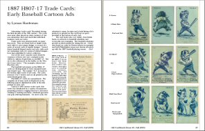 4) "1887 H807-17 Trade Cards: Early Baseball Cartoon Ads" by Lyman Hardeman. The 19th century trade card set labeled by collectors as set H807-17, or more simply the "bluish-green series," is described. A gallery of all nine cards from the set is provided, as are examples of several variations of the printed backs.
