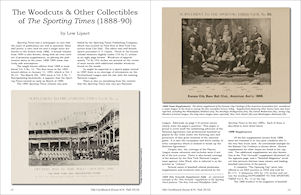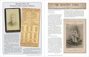 The articles in this issue include: 1) "The Woodcuts & Other Collectibles of The Sporting Times (1888-90)" by Lew Lipset. Hobby veteran Lipset takes a comprehensive look at the little known facts about this obscure newspaper. Several sets of known supplements, premiums and woodcuts produced by the paper are described, along with an informative ad printed in the Times that checklists cabinet premiums sponsored by rival newspaper The Police Gazette.