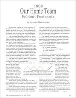 4) "1908 'Our Home Team' Foldout Postcards" by Lyman Hardeman. This set of only five known postcard foldouts is described along with fully expanded views of the player panels for all five cards. A complete checklist of players is provided for the first time for each of the five teams represented.