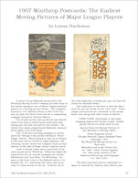 3) "1907 Winthrop Postcards: The Earliest Moving Pictures of Major League Players" by Lyman Hardeman. An overview of this rare postcard flipbook set identifies the three known baseball players from the series (Christy Mathewson, Mordecai Brown and Joe McGinnity). An uncut photo sheet of images used for the Brown flipbbok is described that now resides in the U. S. Library of Congress.