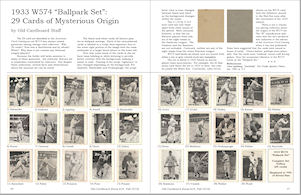 4) "1933 W574 'Ballpark' Set: 29 Cards of Mysterious Origin" by Old Cardboard Staff. An overview of the cards labeled in the American Card Catalog as set W574. The card designs fail to conform to other strip card sets of the period, leading to speculation that they may have been distributed at ballparks. A full gallery of all 29 cards in the set is provided along with examples of the card's two back stock variations.