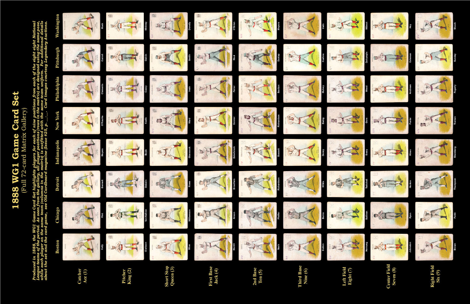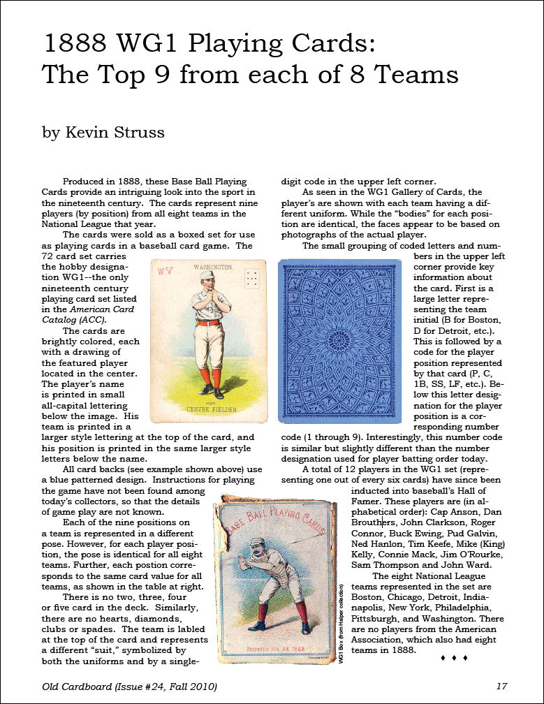 2) "1888 WG1 Playing Cards: The Top 9 From Each of 8 Teams" by Kevin Struss. The basics of this very interesting set of 72 cards that uniformly represents 9 players (by position) from each of the eight National League franchises of the period. Card gallery is arranged for the first time in a revealing centerfold array with each team presented as a column and each player position presented as a row in the matrix.