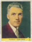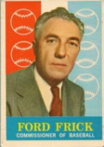 | The true Rookie Card for Ford Frick was produced in conjunction with the 1949 Eureka Sportstamps issue. The earliest mainstream card depicting Frick appears within the 1959 Topps set with the identical photo used for a Venezuelan Topps version issued during the same season but more more scarce than its American counterpart. Additionally, a card of Frick was also included in one other 1959 set which was produced by Fleer and is known throughout the hobby as the Ted Williams issue. Finally, another mainstream card of Frick was included in the 1960 Fleer set. |