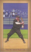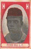 | Although there is believed to be only one copy in existence, the earliest card picturing Pete Hill is the 1909 Cabanas Cuban League card. The following season, another equally scarce card depicting Hill was produced by a company called Punch in conjunction with another Winter League issue. Subsequently, Hill would not appear on another baseball card until 1974 when he was included in the Laughlin Old Time Black Stars set. In addition, one other commemorative card picturing Hill exists and was included within the 2005 Helmar baseball card set. Finally, a BB HOF Postcard depicting Hill was produced during 2006. |