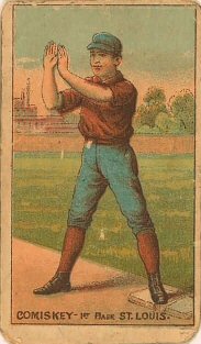 | The most popular Charles Comiskey Rookie Card originates from the 1887-90 Old Judge tobacco set. In addition, Comiskey also appeared on an 1887 Buchner Gold Coin set card, although this issue is not a popular one with many collectors. Two other 1887 issues depicting Comiskey are significantly more difficult to find, the Lone Jack Browns and Gypsy Queens. Finally a card of Comiskey was included in the popular 1888 Allen & Ginter tobacco set. |