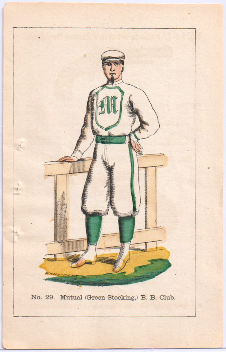 New York Mutuals (Green Stockings) $1250 The ultra-rare 100-page Peck & Snyder catalog provides an in-depth view at some of the most popular sports equipment of the period. It features a total of 29 color plates, the majority of which picture baseball equipment. The highlights, however, are the full-page illustrations picturing the uniform styles for each of seven of the earliest teams of organized baseball. A very clean example of one of these historic color lithographs--that of the New York Mutuals (Green Stockings)--is offered here. The 155-year-old lithograph is in great condition with vivid colors and only slight signs of ware in the left corners. It measures approximately 7-3/8 by 4-3/4 inches. The three pinhole-dimples near the left edge are as originally produced to facilitate the use of a string binding for the Peck & Snyder catalog. One of the earliest, most visually appealing and historic pieces of baseball memorabilia. Further details about the 1871 Peck & Snyder Team Uniform Color Plates set can be found on the Old Cardboard website.