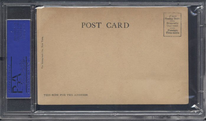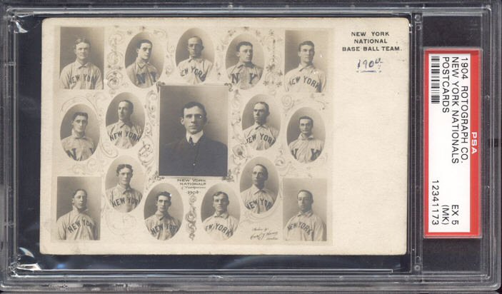 New York National League (Giants) Team Composite $1350 A very scarce and very nice PC782 1904 New York Giants Rotograph Real Photo Postcard of the team composite shot by legendary photographer Carl Horner. There are several HOFers and other notable players on this exemplary piece, John McGraw, Joe McGinnity, Roger Bresnahan, Dummy Taylor, Mike Donlin, Hooks Wiltse and many more. Postally unused, and fairly clean front and back. The postcard has not been mailed and is in very clean condition and without any major flaws on either the front or back. The card is graded EX 5 (MK) by PSA (see high-resolution scans for condition detail). Further details about the 1904 PC782 Postcard Set are provided on the Old Cardboard website.